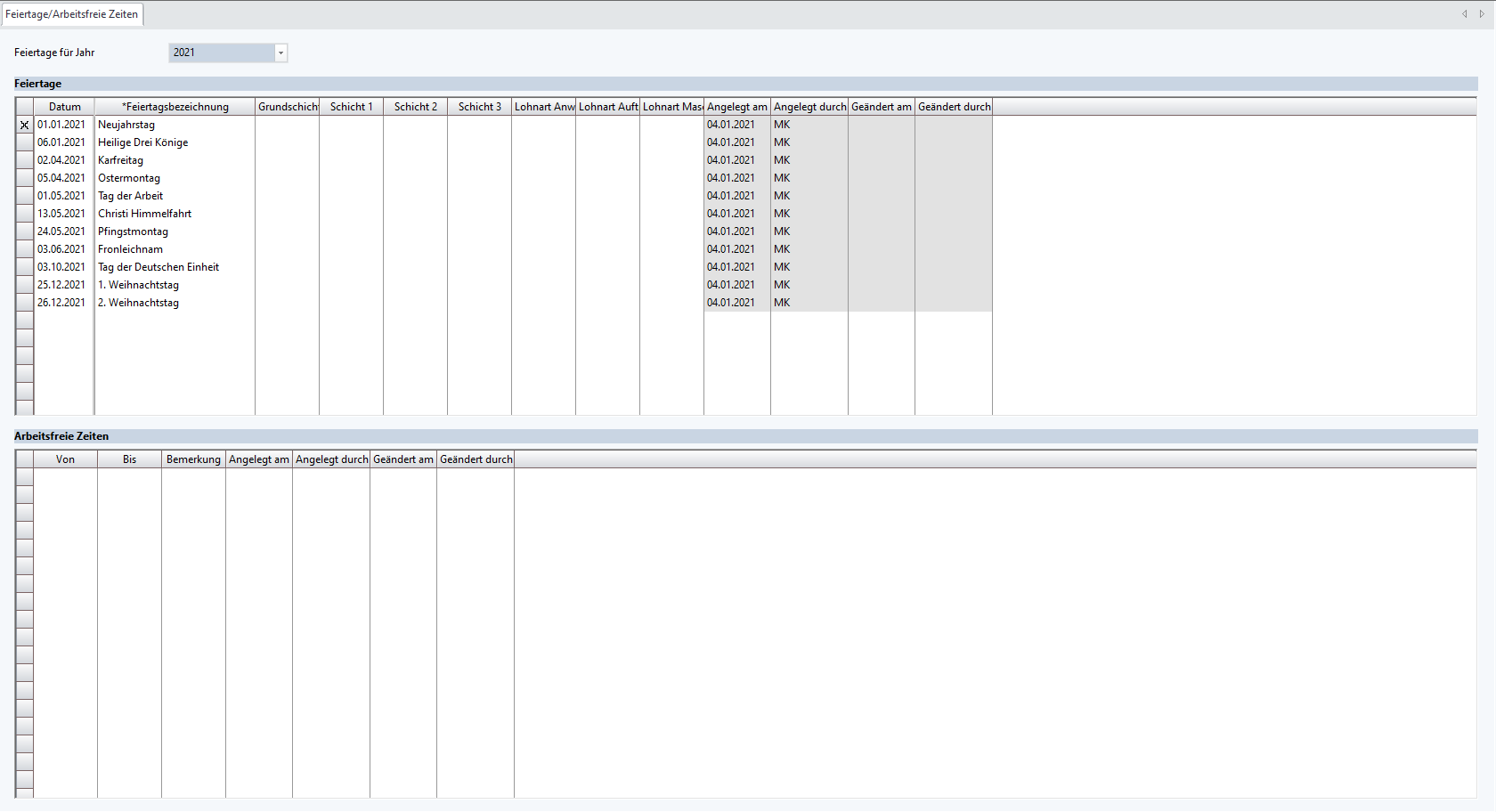 Im Menü Feiertage/Arbeitsfreie Zeiten können Sie eben diese für das laufende und die kommenden Jahre festlegen.