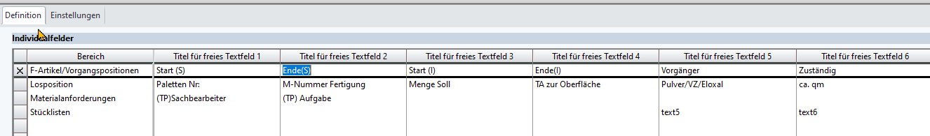 Individualfelder bieten die Möglichkeit in Proflex zusätzliche individuelle Felder in verschiedenen Bereichen (F-Artikel/Vorgangspositionen, Stücklisten, Materialanforderungen, Lospositionen) anzulegen und zu befüllen.