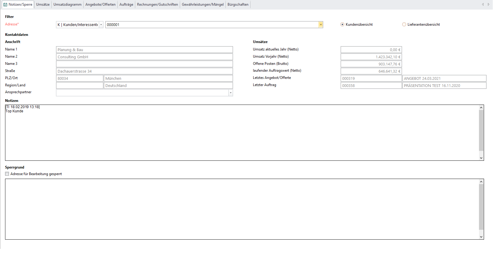 Dieser Reiter Dient dazu, um bei einer Adresse Allgemeine Notizen oder eine Sperre mit Sprerrgrund zu hinterlegen