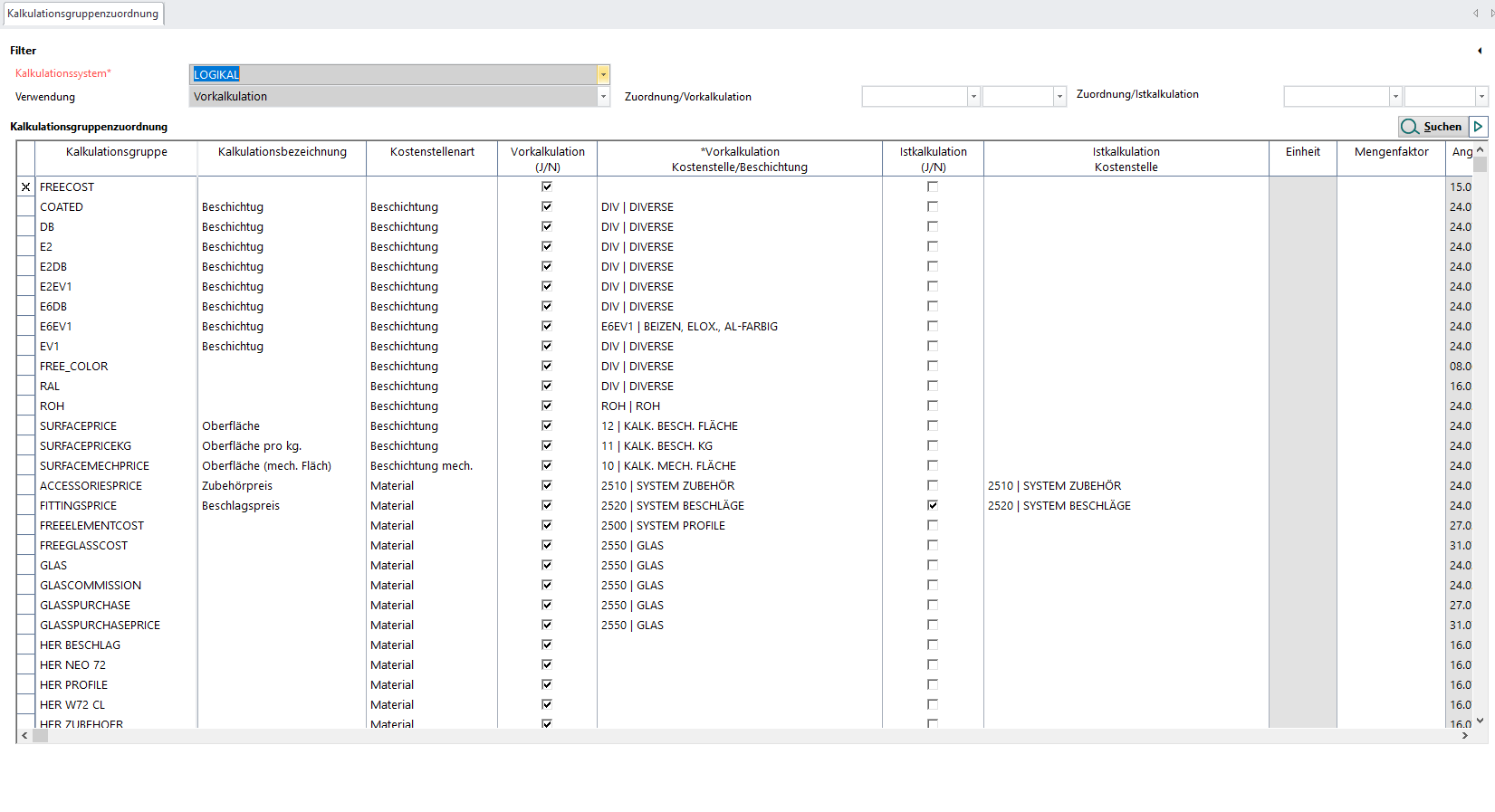 Kalkulationsgruppe | Suche nach Kalkulationsgruppe | |