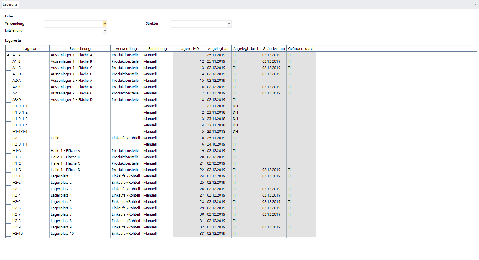 Entstehung | Auswahl: | Filtert nach importierten oder manuell angelegten Lagerorten |