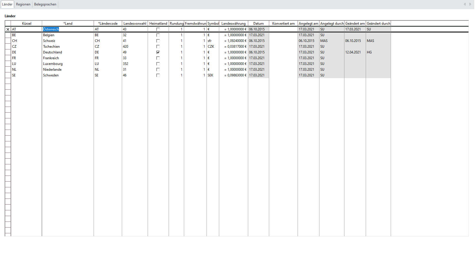 In dieser Maske ist es möglich verschiedene Länder mit ihrer Währung, Telefonvorwahl des Landes und Belegsprache anzulegen.