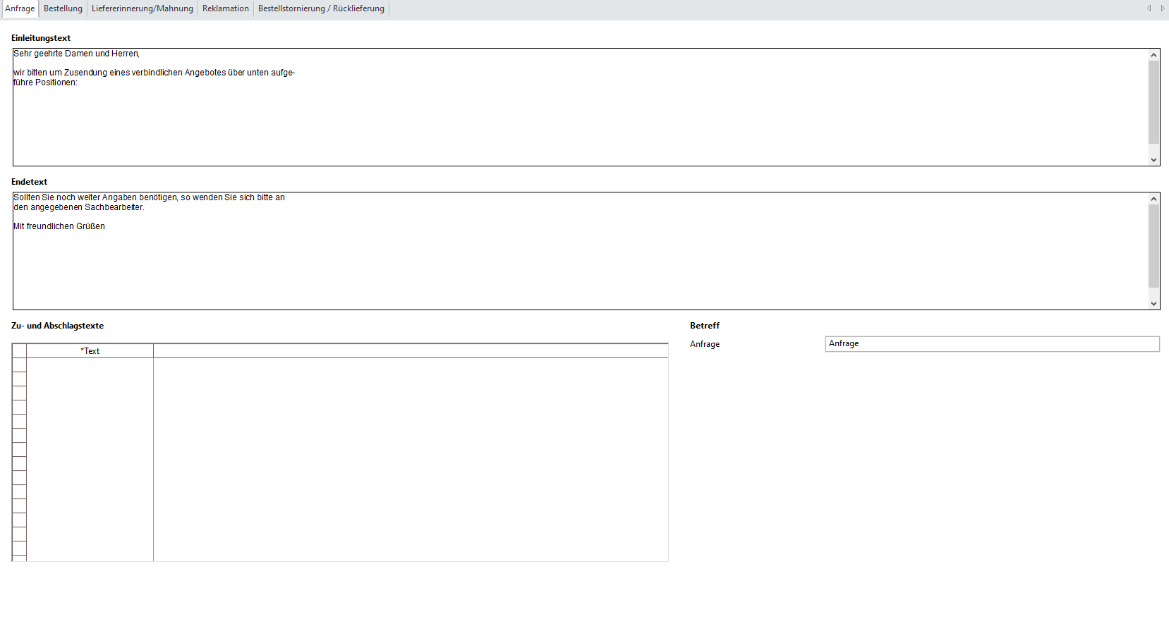 Hier werden Standardtexte für den Bereich der Materialwirtschaft angelegt, die dann bei der Erstellung von MaWi-Anfragen, Bestellungen etc. automatisch in die entsprechenden Felder übernommen werden.