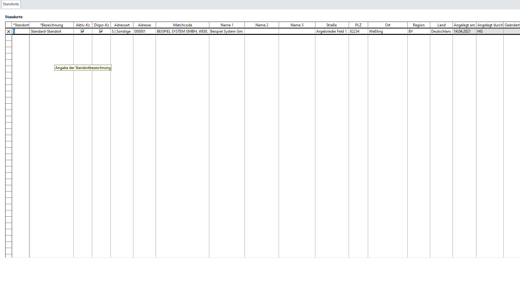 Adressart/Adresse/Matchcode | Die Adresse des Standorts. Besteht aus Adressart, Adressnummer und Matchcode | Die Adresse muss vorhanden sein Siehe Adressen |