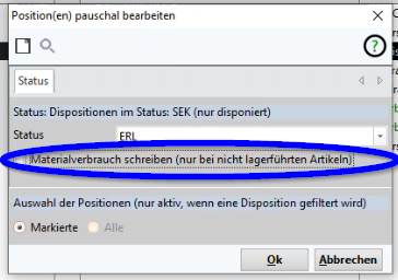 Rechte Maustaste oder Werkzeugfunktion - Bearbeitung - Status setzenwählenDen Status auf ERL und den Haken Materialverbrauch schreiben (nur bei nicht lagergeführten Artikeln) setzen