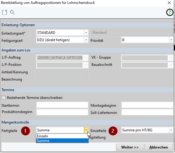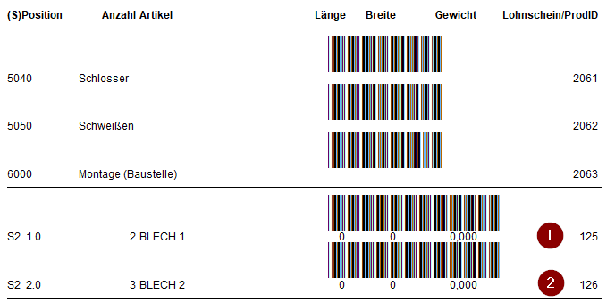 Der Ausdruck der Fertigungspapiere muss dann die Teile-I.d.Nr. als Barcode enthalten.(1+2)