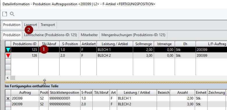 Unter <Produktion> Produktions-ID sind die Teile ersichtlich