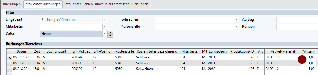 Hier sind die gebuchten Kostenstelle, der Lohnschein, Mitarbeiter und immer die Menge “1” ersichtlich.
