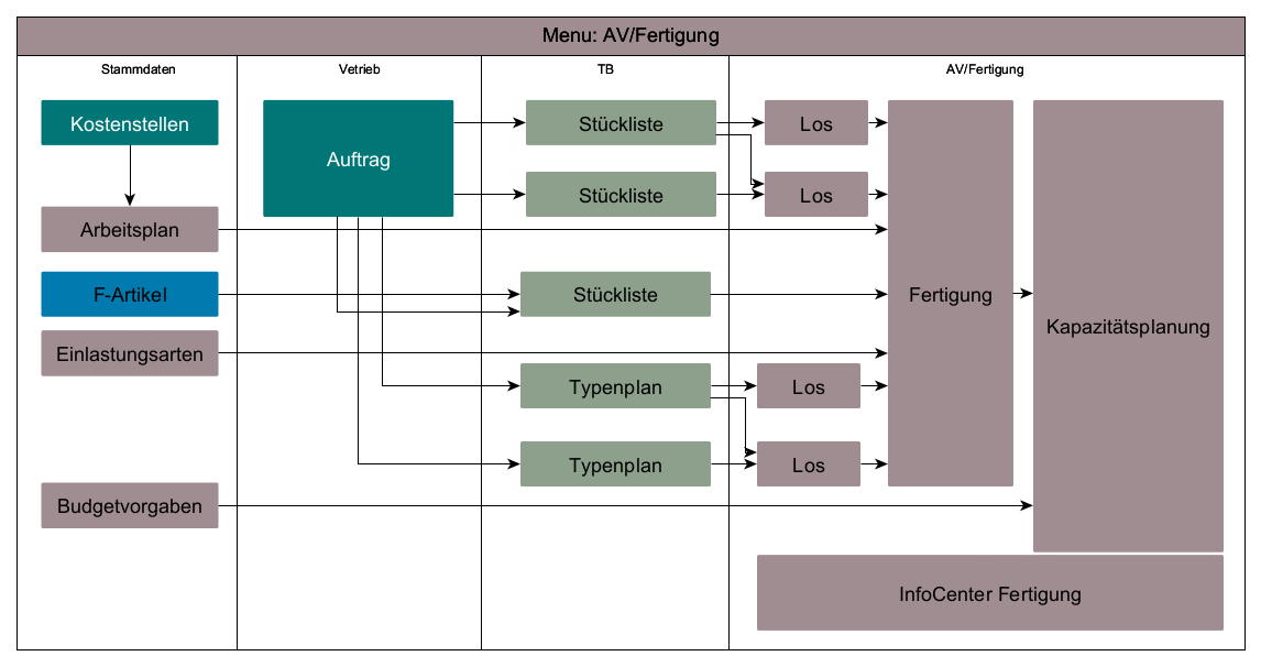 Das Modul Arbeitsvorbereitung/Fertigung dient zur Planung und Vorbereitung der Fertigung von Erzeugnissen (F-Artikeln).