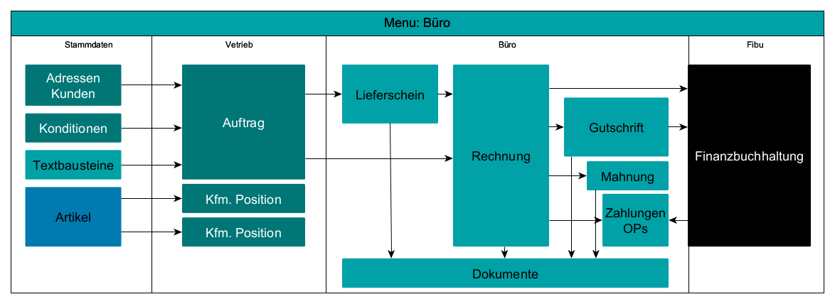 Das Modul Büro dient den der Fertigung nachgelagerten Prozessen bis hin zur Finanzbuchhaltung. Hier finden sich auch einige Schnittstellen.