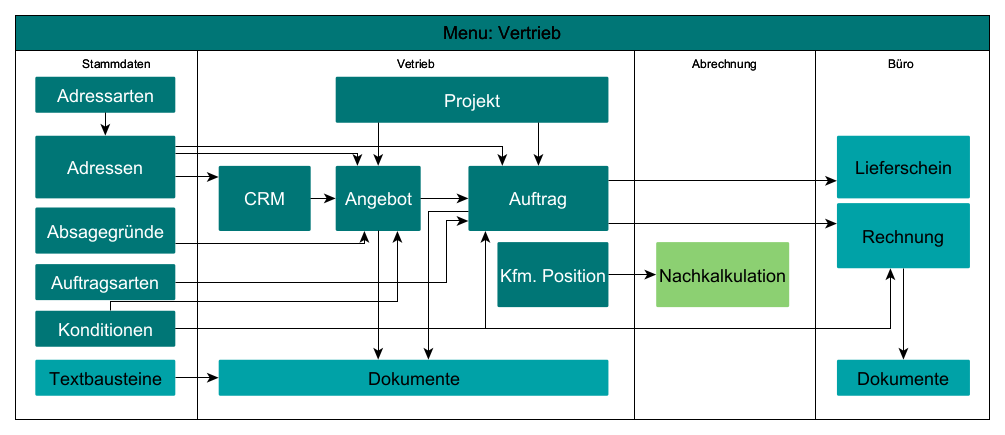 Das Vertriebsmodul deckt den Verlauf eines Auftrags, von der Akquise über das Angebot bis hin zum Auftrag selbst ab.