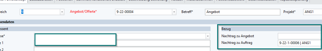 Im Angebotskopf des Nachtragangebotes, wird unter <Bezug> der Auftrag angegeben, den es schon gibt.