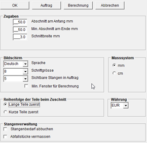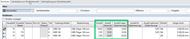 Anhand der angebotenen Längen, (Lieferant bietet Längen an, welche am Lager sind) kann nun in der Stückliste festgelegt werden, wie viele auf Lager, fix oder optimiert werden.