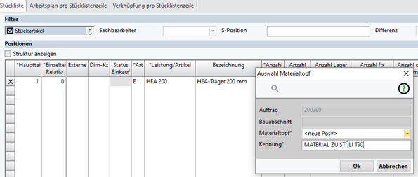 Auftrag | Reiter <Technische Positionen> |Stückliste