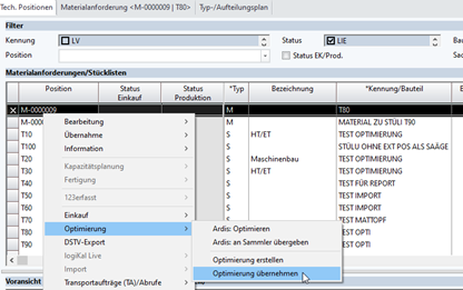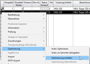 Diese werden in der Stückliste ausgewählt und mit der Funktion <Optimierung | Optimierung erstellen> an die Optimierung übergeben.