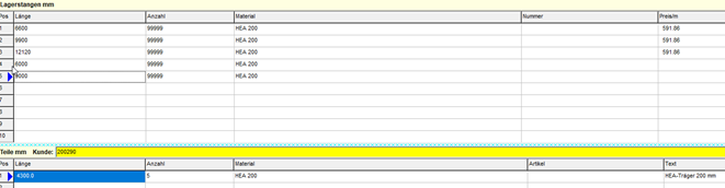 Wenn DimKz „E“ ist dann erfolgt die Anfrage mit der angegeben Länge. Artikelstamm ( 2 Stk je 6000 mm, es werden 2 Stk je 6000 mm angefragt)