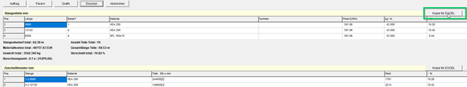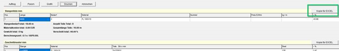 In der Ergebnistabelle wird in der oberen Tabelle der Button <Kopie für Excel> gewählt.