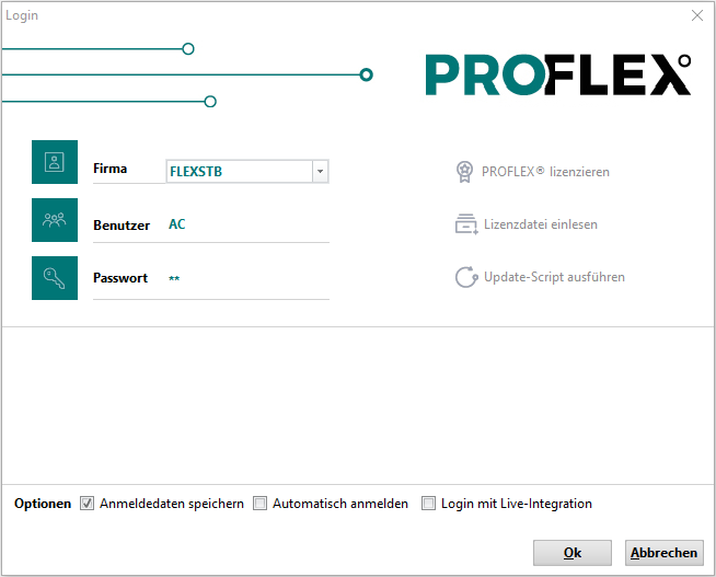 Nach der Installation von PROFLEX® am PC des Benutzers befindet sich folgendes Icon auf dem Desktop. Durch Doppelklick auf dieses Symbol wird PROFLEX® gestartet und man erhält folgenden Login-Dialog.