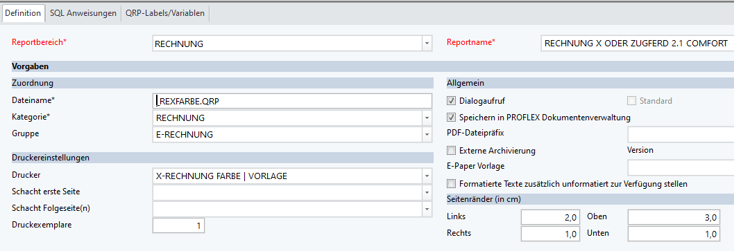 Zur Erstellung einer E-Rechnung über diesen PDF-Treiber wurden eigene PROFLEX® Rechnungsvorlagen (Report) erstellt, die den Kunden zur Verfügung gestellt werden und importiert sein müssen. Dies sind: