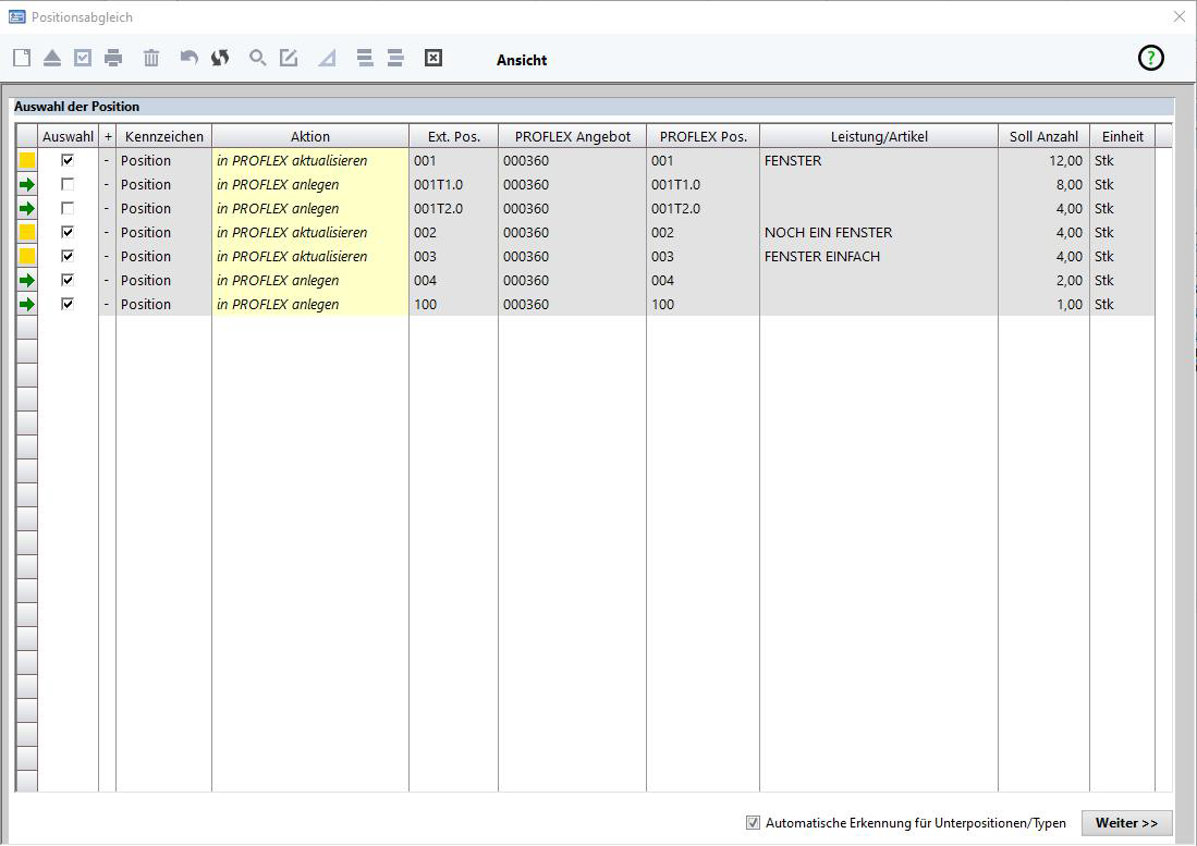 Mit dieser Option findet der tatsächliche Abgleich/Datenaustausch der Positionen von SchüCal® in Richtung PROFLEX® statt.