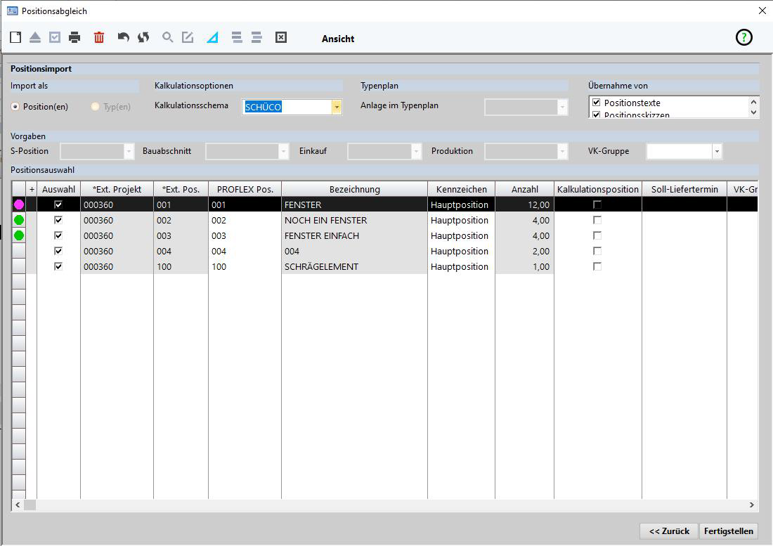 Dieser Aufruf ermöglicht die Übernahme von bestehenden PROFLEX® - Positionen an SchüCal®. Die zu übergebenden Positionen sind zu markieren. Die Übertragung erfolgt im Hintergrund automatisch. Die übergebenen Positionen erhalten in der Spalte Externe Positionsart den Eintrag: SCHÜCAL.