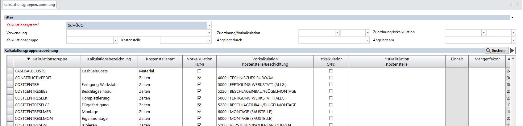 Es wir die Zuordnung des bestehenden Kalkulationssystems SCHÜCO verwendet. Es müssen die in der neuen SchüCal® Schnittstelle verwendeten Kalkulationsgruppen zusätzlich angegeben werden. Die bestehenden Kostengruppen für den Artikelimport bleiben unberührt.