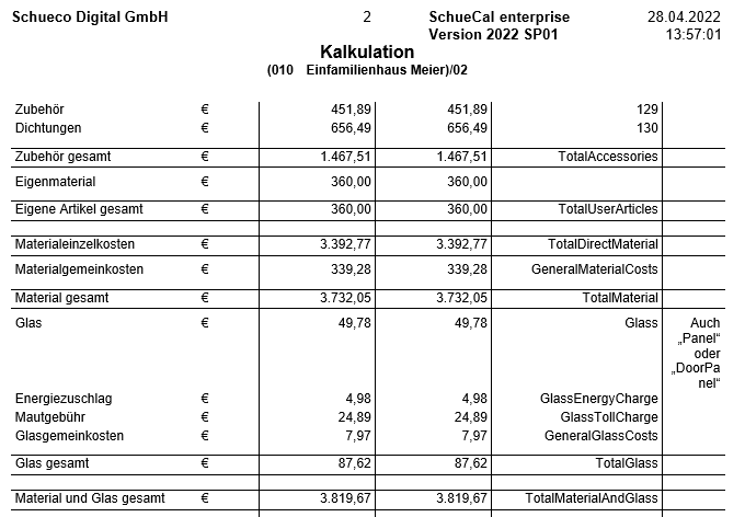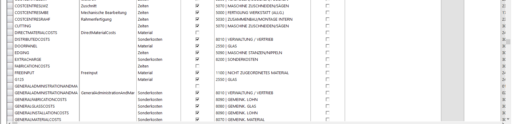 Die Fertigungskosten (Preisermittlung) und die Fertigungszeiten (Produktion) werden von SchüCal® getrennt übergeben. Es werden jedoch die gleichen Kostengruppen verwendet. Diese beginnen in der Regel wie folgt: