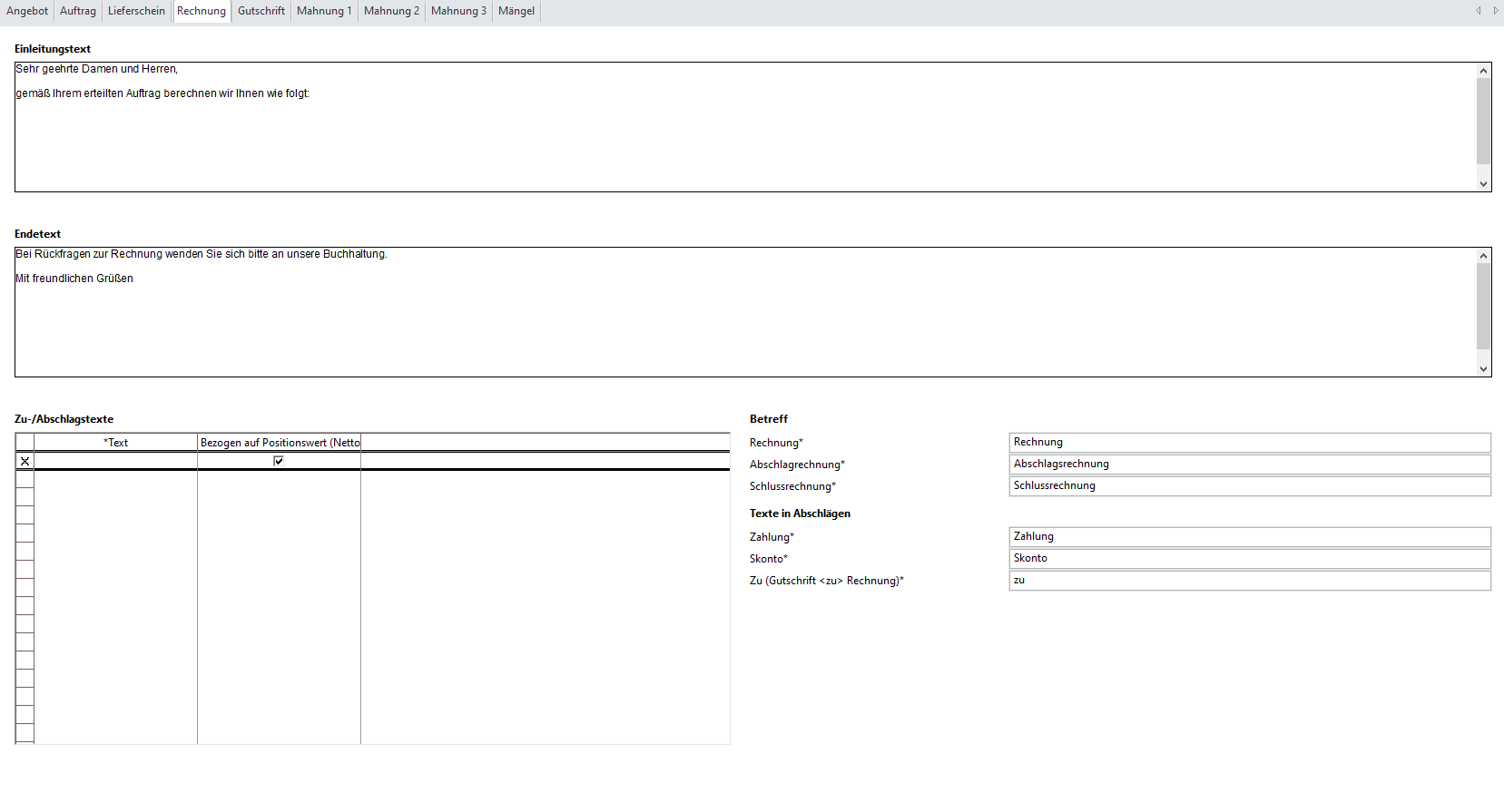 Hier werden Standardtexte für das Erstellen von Rechnungen definiert.