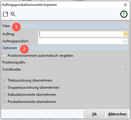 Im neuen Fenster Auftragsproduktionswerte kopieren ist es möglich über die Filter (1) einen beliebigen Auftrag per Dropdown-Menü oder mittels Doppelklick über die Suchmaske auszuwählen. Wurde bereits der Auftrag ausgewählt, kann unter Auftragsposition die gewünschte Position, oder mehrere Positionen markiert und übernommen werden.