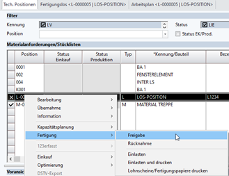 Die Funktion <Freigabe> stellt die Stückliste oder einzelne Positionen hieraus im Programm <Fertigung – Fertigung/Losbildung> zur Verfügung. (Lizenzierung)