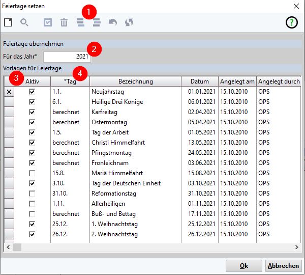 In der Spalte Aktiv (3) Kann man einzelne Feiertage aktivieren oder deaktivieren, wenn diese für unser Land/Region nicht zutreffend sind.